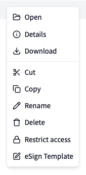 For example you can rename, cut, copy, delete, change the restrictions on folders and files, and create an eSign Template to send for e-signature.